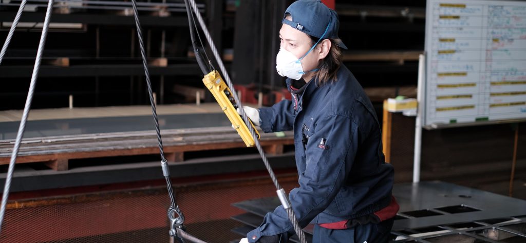 レーザー加工機のオペレーター、出来上がった製品の仕上げ、班員への指示出しを行います。 オペレーターが流れ良く加工機を操作できるように、声を掛け合いながら材料のセットやバラシ作業、製品のバリとりなどを行います。 次の工程の人にわかりやすい様に台車に製品を並べたり、製品に余計な傷を入れないよう仕上げたりと気遣いと丁寧な仕事を心掛けています。加えて、効率とスピード感が重要です。常に時間を意識して生産性を上げます。